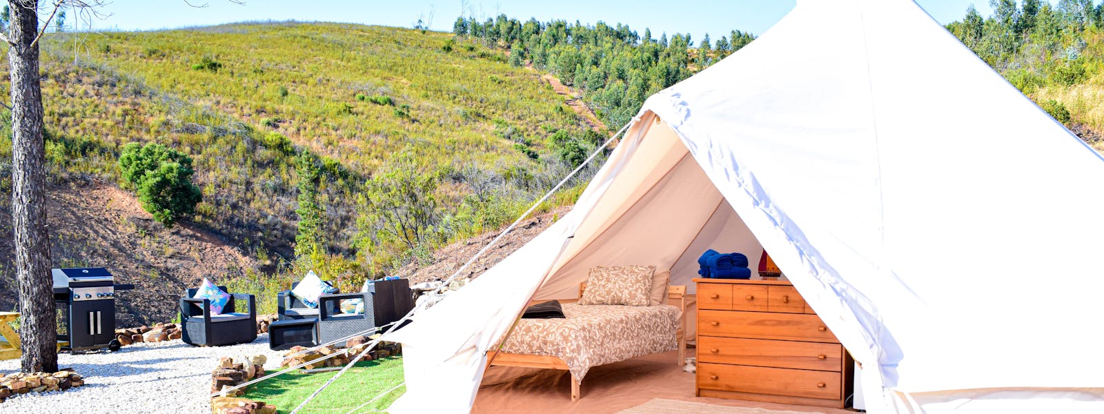 Quinta Glamping – a luxury boutique off-grid glamping experience with Yurts & Bell Tents. Nestled in the foothills of the Monchique mountains, only 20 minutes from the Algarve coast and less than an hour from Faro airport, surrounded by unspoilt nature. Set on a 20-acre property, featuring a secluded saltwater swimming pool, adjacent BBQ cabana & bar, free WiFi, extensive gardens encompassing a children’s playground, large playing field for ball sports, 2 lakes, and extensive natural walkways.