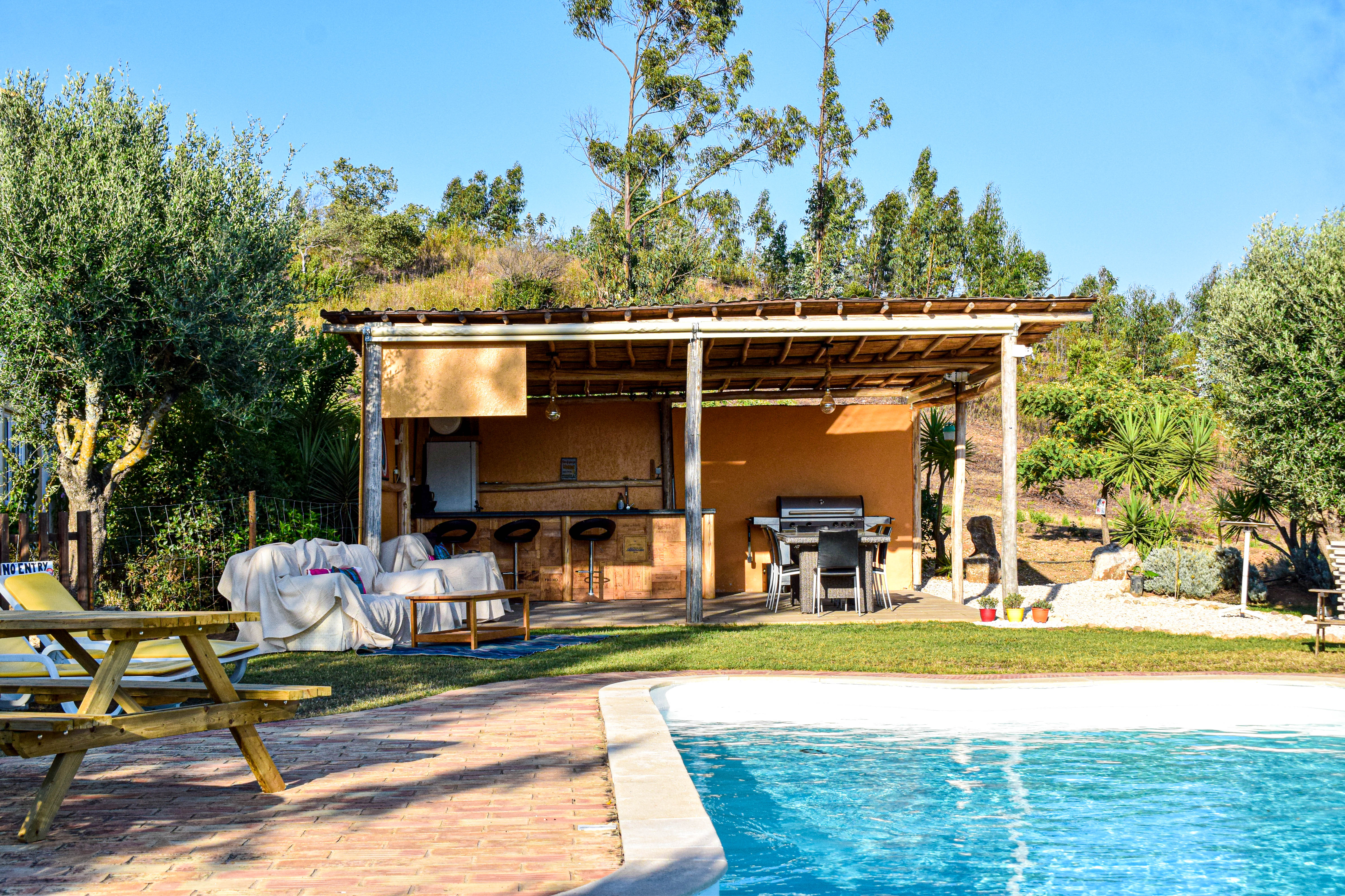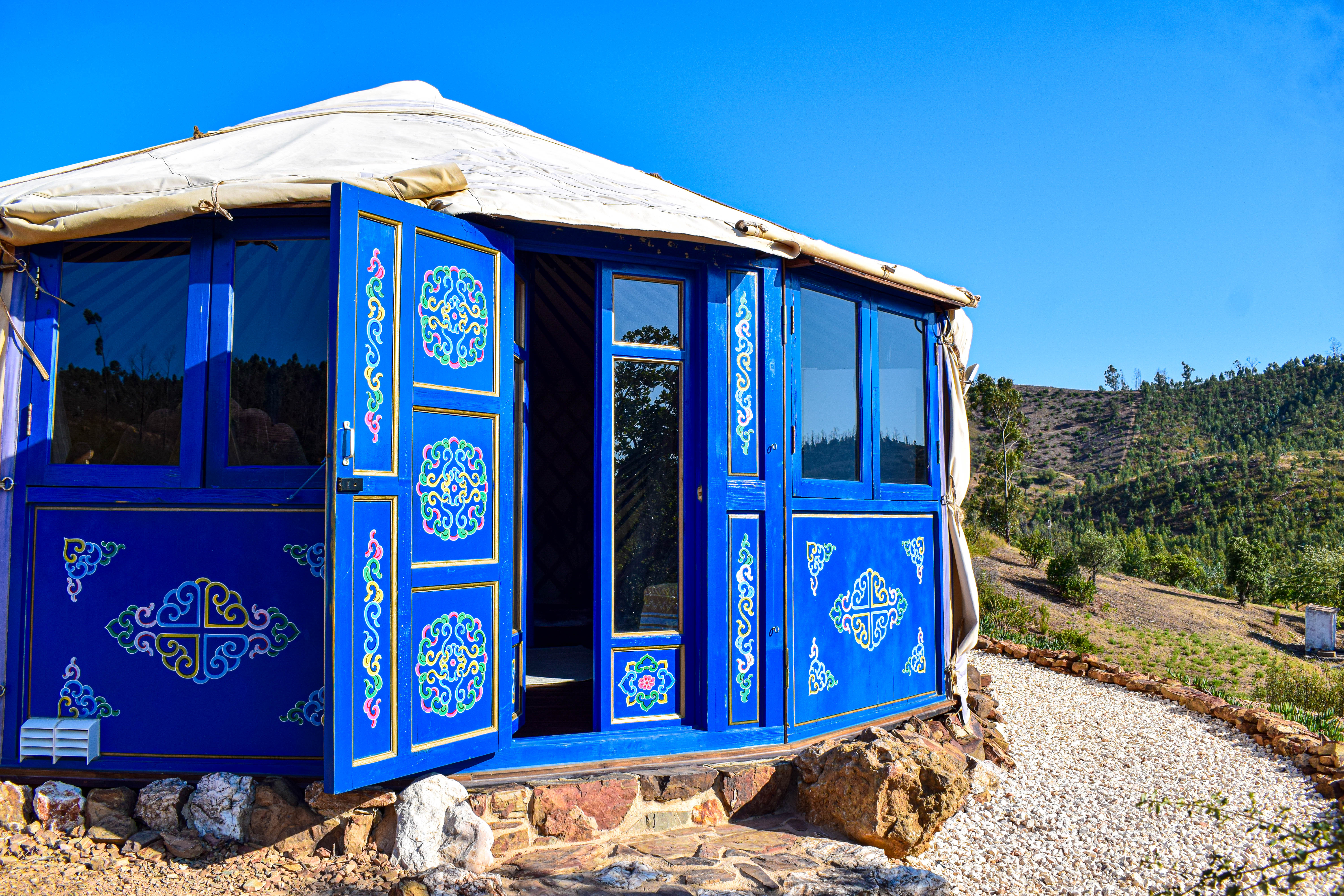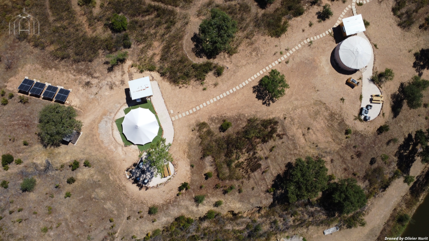 Quinta Glamping – a luxury boutique off-grid glamping experience with Yurts & Bell Tents. Nestled in the foothills of the Monchique mountains, only 20 minutes from the Algarve coast and less than an hour from Faro airport, surrounded by unspoilt nature. Set on a 20-acre property, featuring a secluded saltwater swimming pool, adjacent BBQ cabana & bar, free WiFi, extensive gardens encompassing a children’s playground, large playing field for ball sports, 2 lakes, and extensive natural walkways.