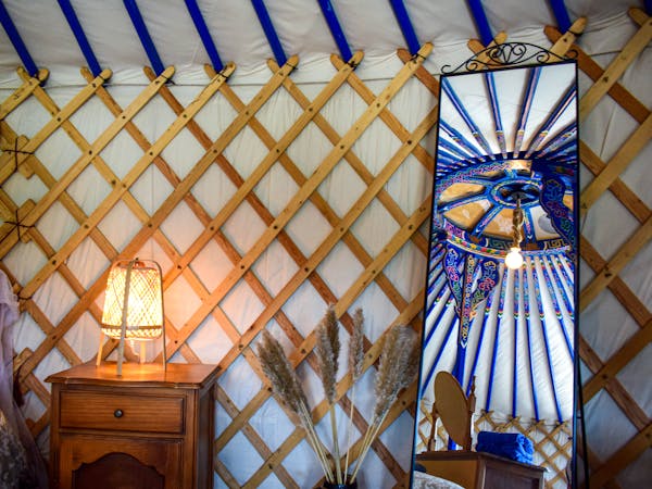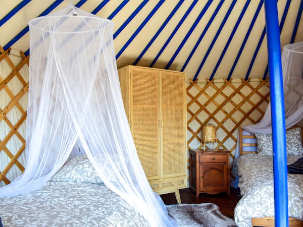 The Lake View Yurt has a king size double bed, 2 single beds, a private en-suite bathroom, private sun terrace with stunning lake and countryside views, perfect for admiring the dazzling night sky.