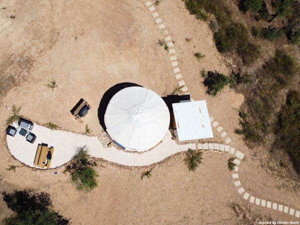 The Lake View Yurt also has air-conditioning and is slightly larger than the Bell Tent, offering more space and more inside facilities – all electricity supplied by photovoltaic renewable solar power.
