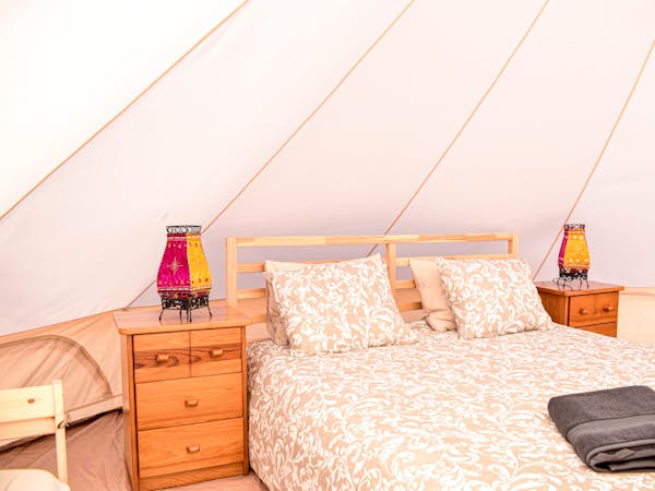 The Bell Tent has a king size double bed, 2 single beds, a private en-suite bathroom, private sun terrace with stunning lake and countryside views, perfect for admiring the dazzling night sky.